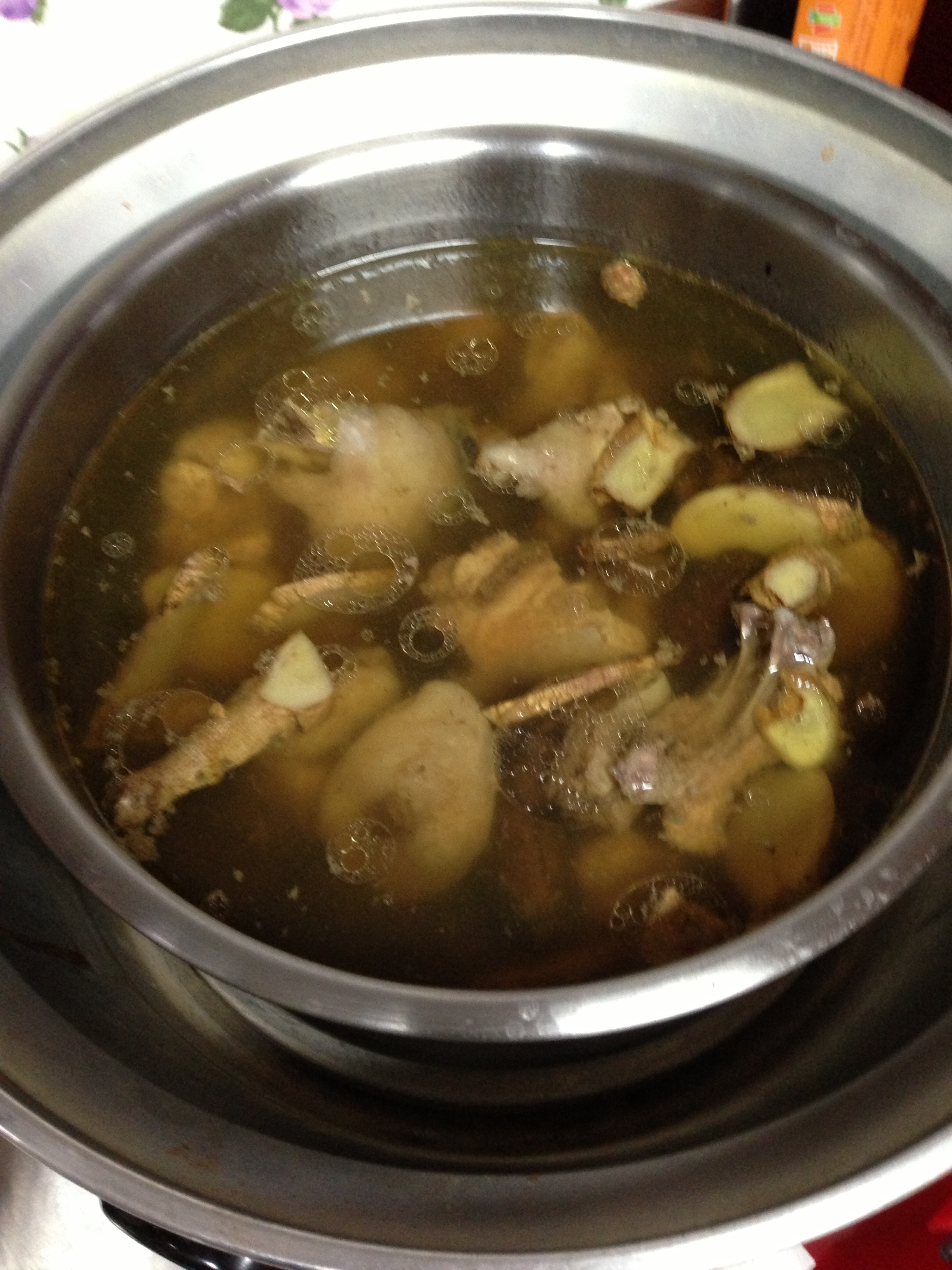 1. 凍雞取出來解凍,雞爪去掉。 2. 將香菇洗乾淨用涼水泡發,泡好的水備用。 3. 把雞放進沸水裡煮一分鐘左右。 4. 撈出立刻放進涼水裡清洗乾淨。 5. 電鍋裝涼水+泡髮香菇的水,把雞放進去,再放幾片生薑。 6. 外鍋放一米杯半的水,煮到跳開即可 雞肉非常鮮嫩,吃一口,真是很香哦,強烈推薦此款湯!